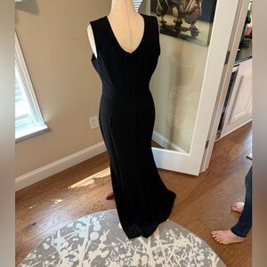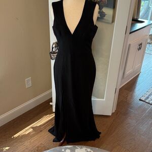 Chic black evening dress with a deep V-neckline. Features a stylish front slit. Perfect for formal events. Never worn event was cancelled
