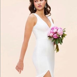 The luxe crepe material of the Sandra Slit Crepe Gown will truly have you feeling - and looking - like a million bucks. Mermaid style allows for this dress to be the shining star of any event. This dress is new with tag however the bottom is a bit dusty due to try-on. It will need to be dry cleaned. Price reflects this.
