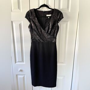 Shimmering sequins adorn the bodice of an elegant sheath dress that's perfect for an evening out.