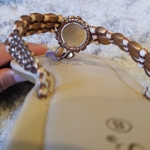Beautiful metallic copper-tone flip flops purchased at a local street fair/festival in the Hamptons! Worn once to dinner, so they're very lightly used. All hand beaded thong with pretty large centerpiece. There is a rubber sleeve on the part that is is between your toes - alleviates any discomfort/friction.