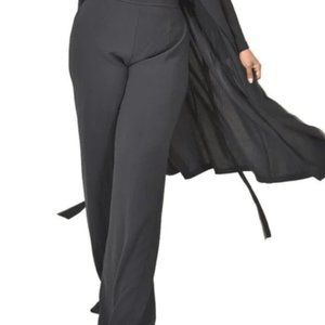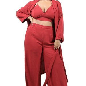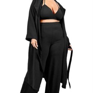 3 piece - jacket, bralette, and wide-legged pants. Back waistline has elastic for more stretch. Only available in the color black.