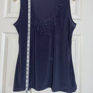 Steel gray tank with flowy drape and stretch, plus cute detail along scoop neck. The deeper color is more accurate ... some of the shots got washed out from the flash. See photos for measurements of length, pit-to-pit, and strap width.