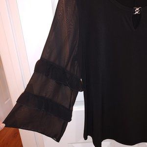 This pretty black top by Diana Belle lives up to its name with ruffly 'bell' like sleeves. Sewn-in gold tone clasp holds the keyhole neckline together. Wear to the office or a night out! Approximate measurements: Pit-Pit 20", Length 24.5". The sheer, above-wrist sleeves are approx 18.5" from shoulder seam. 95% polyester 5% spandex. See photos