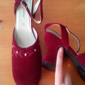 Vine and jeweled detailing. Ankle straps. 1&1/2 in heels. Velvet or suede (can never tell the difference). Worn once. In excellent condition. Been sitting in my closet