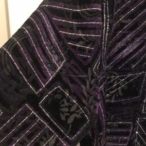 Purple, black, and gray with shiny silver accents. Patterns of rectangles with a floral background. Inside is elegantly stitched in black floral patterns. Dry clean only.