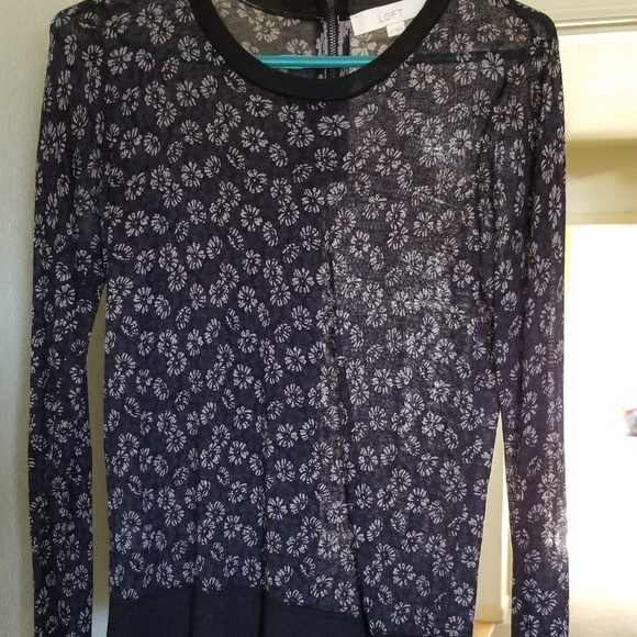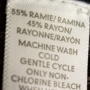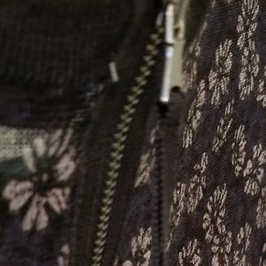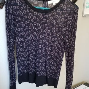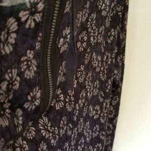 Worn a few times. EUC. Dark Blue/Black background color. Pattern is light a pale pink, cream color. Back has a short zipper for ease of getting in and out of this beautiful top. Approximate measurements are: 25 1/2" sleeves, 24 for length and armpit to armpit: 17".