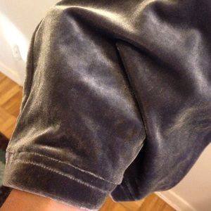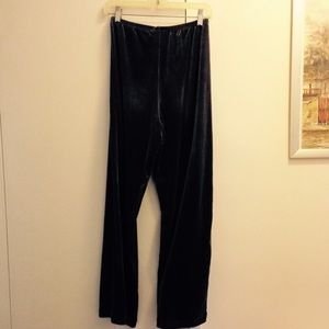 Dark gray / charcoal dress pants with elastic waist and faux drawstring. Flow-y legs allow for ease of movement. The elastic and dimensions around the top of the pants subtly highlight the waist and derrière.