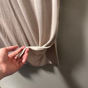 This top fits nicely on the top, and hangs down past the waste. The slits in the sides makes for a really feminine cut and style. It is a little clingy on the body, but also has some room if you like a baggier fit. Goes great with all work pants/skirts and can easily be dressed up or down.