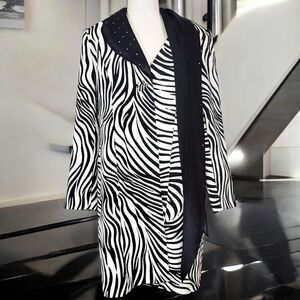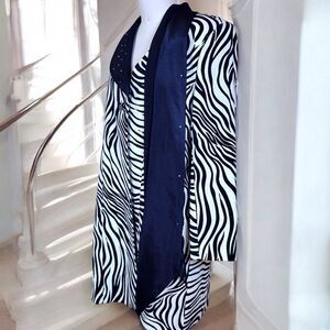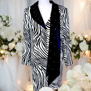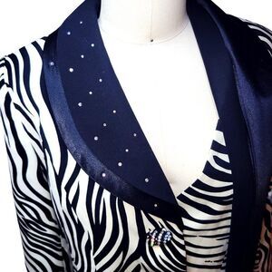 Features: single rhinestone encrusted button closure, attached black scarf drape, shoulder pads, lined, a removeable neckline cover