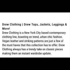 Drew Clothing is a wonderful addition to my boutique this season. The tops have an urban vibe and go from comfortable to dressy. This line has a great design esthetic and the quality is amazing. I hope you enjoy it as much as I do.