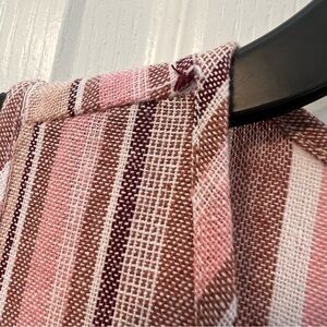 Drew Striped Linen Blend Sleeveless Cropped Jumpsuit Pockets No Drawstring Pink Tan Sz M - in excellent used condition. When laid flat, jumpsuit measures approximately 20 inches from pit to pit and 51.5 inches long, from shoulder to hem. Leg inseam is approximately 22.5 inches. PLEASE NOTE drawstring belt is missing. An external bell can easily cover this area. PLEASE see last pic, one small “flaw” near right collar area. Questions are welcomed.