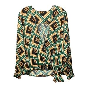 Drew by Anthropologie Vienna Blouse Emerald Brown Beige Abstract Geometric Drop Shoulder Wrap Tie Top