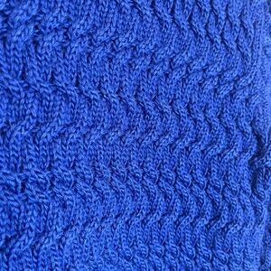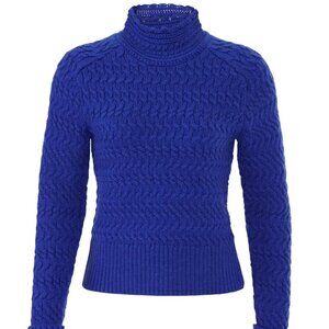 Magnificent blue turtleneck sweater with gorgeous cable knit detailing. I love the neck on this and the color is so brilliant in person. This is 100% merino wool so you do need to wear a bodysuit underneath for the itch.