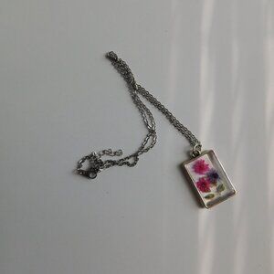 Dried Pink & Purple Flower Pendant Necklace - Resin Bezel, Silver-Tone Chain