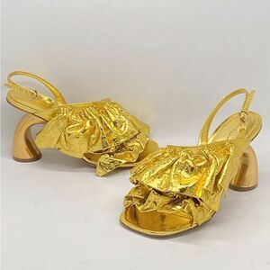 Set atop a curved heel, these sandals from Dries Van Noten are crafted of metallic leather. A ruffled strap finishes the look.