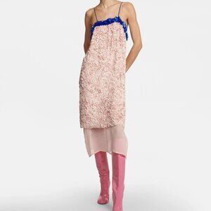 Dries Van Noten's latest collection started with texture-focused, all-black looks that gradually introduced pale hues and floral patterns. The show evoked optimism, celebrating life's beauty through vibrant colors and flowers. Finished with a semi-sheer hem, the layered Dastra midi-dress is finished with a contrasting sequin-embroidered neckline and bodice. Square neck Spaghetti straps Side slit Square back Pullover styleLined100% viscose Dry clean Imported SIZE & FIT About 50" from shoulder to hem Model measurements: 5'10" tall Model is wearing a US size 4