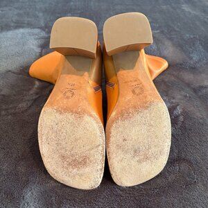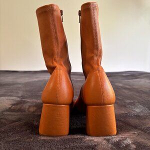 Beautiful leather ankle boots in camel-colored leather. Great condition at the heel and toe; soles still have some life in them!