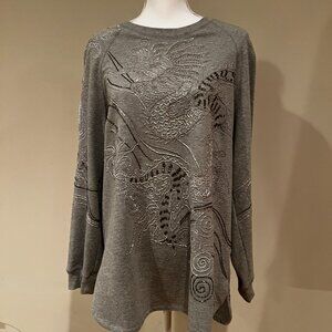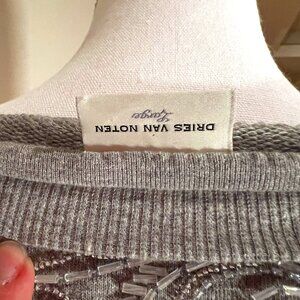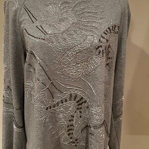Super swanky sweatshirt! Dries Van Noten beautiful beaded dragon + phoenix motif. Grey sweathshirt material, 100% cotton. Never worn, and in great condition. Fits a true large, approx. size 10-12. Chest is 38, waist is same. Length is approx. 29-30, tunic length. Front and back are beaded, along with both sleeves. Shoulders has fitted structure with top darts, making it a bit more dressy than a sweatshirt.