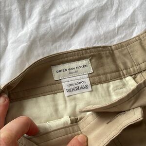Very chic tailored Dries Van Noten pants. These are lightweight and 100% cotton and great for spring and summer. I had them taken in at the waist slightly so please refer to measurements. Would fit a 4/6 best. Extra button sewn in interior. Waist: 28”; rise: 12.5”; length: 40”