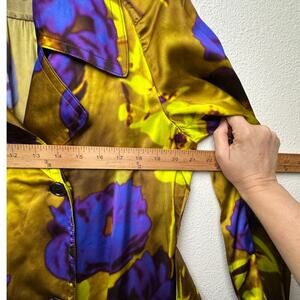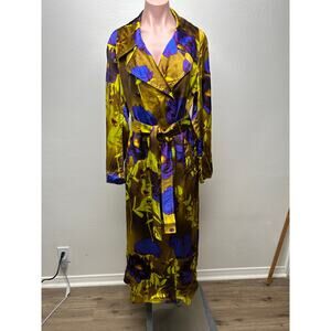 Satin-finish trench with double-breasted front, removable tie belt, notch lapels, and patch pockets. Floral print from the Len Lye label. Fabric per tag: 86% viscose, 14% silk. Longline, lightweight layer for dressy or statement everyday wear. Made in Poland. Care: dry clean only.