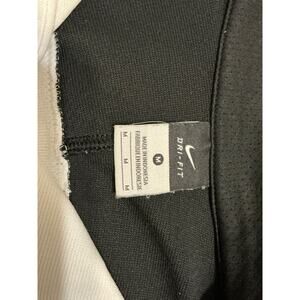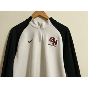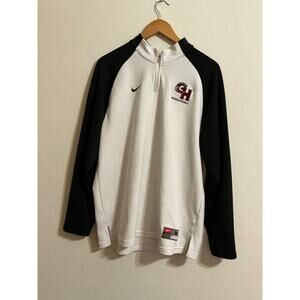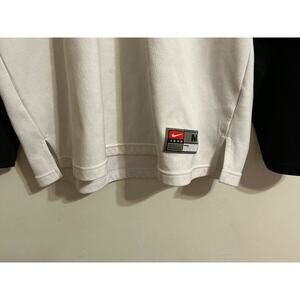 The Dri-fit Adv Tour Long Sleeve Golf Shirt in white and black features a half zipper for easy on and off. Made of polyester, this shirt is designed for activewear with a solid pattern and logo accents. It's suitable for casual occasions and golf performance during the spring, summer, and fall seasons. The Nike Golf product line ensures quality and style for men's regular fit sizing, making it a practical and stylish choice for any golfer.There are small spots.