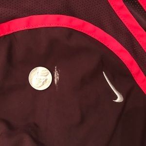 Burgundy Nike shorts great worn condition. Small white paint mark. As shown in picture compared to size of nickel.