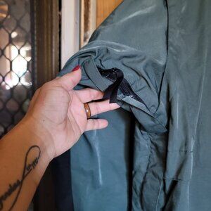 The jacket also features a collared neckline, zipped pockets, and a lightweight design. The pockets are perfect for storing your essentials, while the 1/4 zip with Velcro provides extra warmth and protection. The jacket is available in XL size and comes in a stylish green color. Add this 90s-themed windbreaker/parka to your wardrobe today!