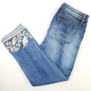 Driftwood Colette floral cuff raw hem stretch embroidered denim jeans, women's size labeled "29x26" with actual specs of 31 waist and 26 inseam. I've included exact measurements, so you'll know if this fits you or not. Ships safely in a secure box :)