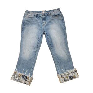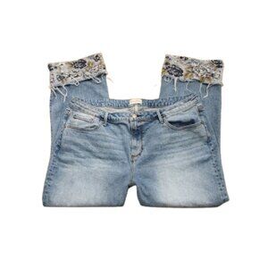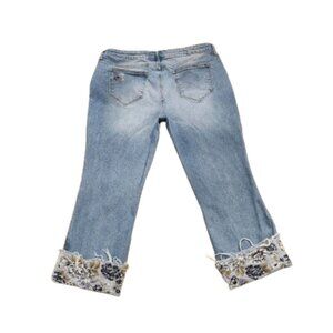 Light rinse stonewashed cropped raw hem jeans. High-waisted. Single button and zipper front closure. Cuffed hems featuring floral embroidery. Whiskering accents. Sanded detail. Five pockets.