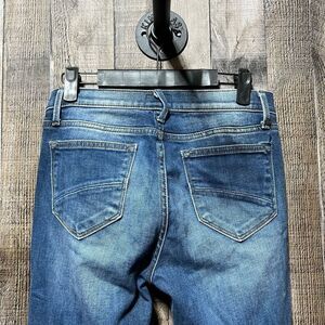 Details: embellished hems, medium wash, high waisted, skinny fit, factory raw hem, very stretchy