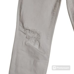 White ankle length skinny jeans. Light distressing around pockets and hem. Holes by the knees.