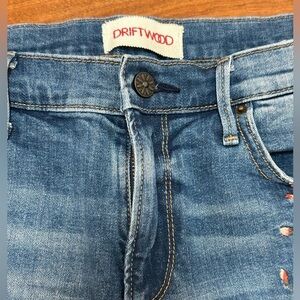 Driftwood’s signature floral embroidery on a soft mid‑wash denim short—boho and easy. Mid rise, classic 5‑pocket styling, rolled cuffs (secure tack), and a touch of stretch for comfort. Tag 27. Cotton/elastane blend. Excellent preowned condition; subtle whiskering by design.