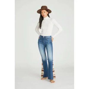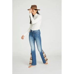 Farrah Flare with Tapestry Embroidery Inserts in Medium Wash.