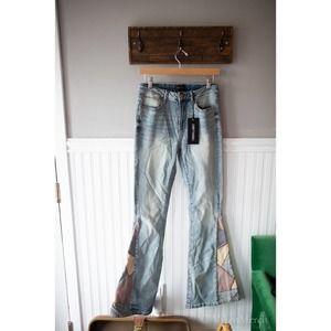 Embrace your inner cowgirl with the Farrah Flare from Driftwood Jeans. Featuring suede patchwork inserts in a light wash.
