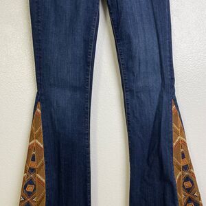 Driftwood Free People Flare Jeans Size 27 Farrah Embroidered Denim Raw Hem Boho