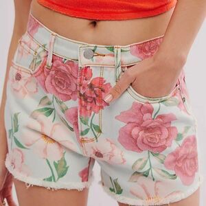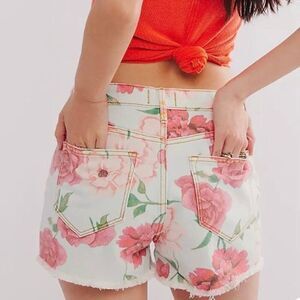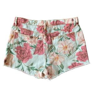 Driftwood Goldie pink and blue floral print denim mid rise fray hem shorts.