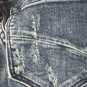 Dark Wash. embroidered floral detail. Light intentional distressing to back. Raw hem. Zipper and button closure.