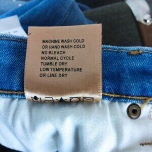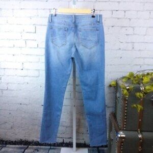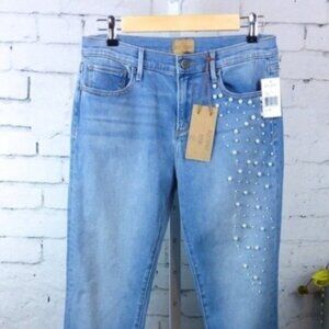 -Features: Jackie skinny jeans, high-rise, ankle length, light wash, factory distressed with fading, whiskering and raw hems, pearl embellished