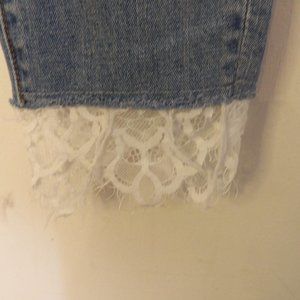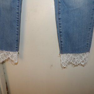 lighter blue wash , skinny to straight leg has added white lace to hems probably done as DIY but done well , 5 pocket style with belt loops , material is 98% Cotton 2% Spandex , Sz 29 rise measures 10" Inseam measures 22" add 2" more for lace , waist lying flat measures 15.5" , Good pre owned or used condition no holes stains or distressing , minor washing wear noted , pet friendly non smoking home