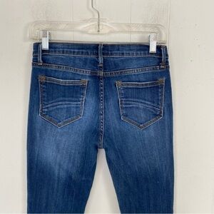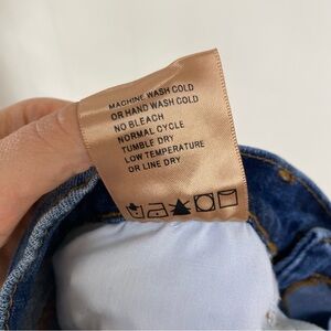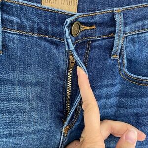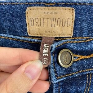 The product is a pair of Driftwood Jackie Rose floral embroidered skinny jeans in size 26. These jeans feature a raw hem and stretch fabric for a comfortable and stylish fit. The design includes a beautiful rose floral embroidered accents, adding a unique and trendy touch to the classic skinny style. Perfect for women looking for a fashionable and eye-catching addition to their wardrobe.