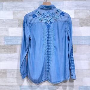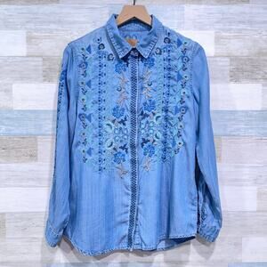 Driftwood Lana Floral Embroidered Chambray Shirt Blue Tencel Boho Womens Small