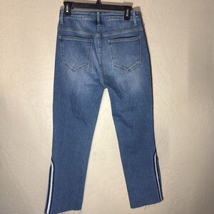 Driftwood Stella Slit Straight - Blue Melodrama stripe down the sides. Size 27. Lots of stretch. High rise.