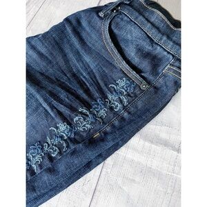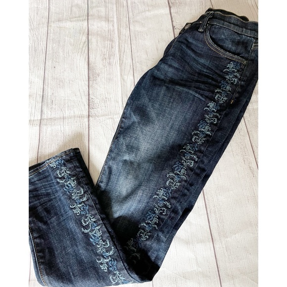 Driftwood embroidered Sundance blue jeans, sz 28. Excellent used condition; freshly washed and steamed. Measurements shown in photos.