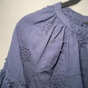 This adorable Driftwood peasant blouse is a must-have for your wardrobe! In a beautiful navy blue, this women's size small blouse features eyelet embroidery and delicate floral details.