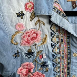 Driftwood embroidered “Detty” cap sleeve chambray boho western Top XL