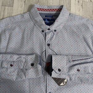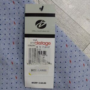 The slim fit and easy care features make it a stylish and practical choice. The shirt also includes pockets, adding to its functionality. The multicolor lightning bolts pattern and Drill Clothing Co. logo accent add a touch of modern style to the classic theme. This shirt is a must-have for any fashion-conscious man's wardrobe.