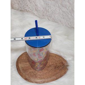 Drink Tumbler with Lid and Straw. No chips or cracks. Preowned. Measures approximately 8 x 3.5 inches. Please see pictures for measurements and details.