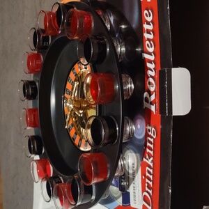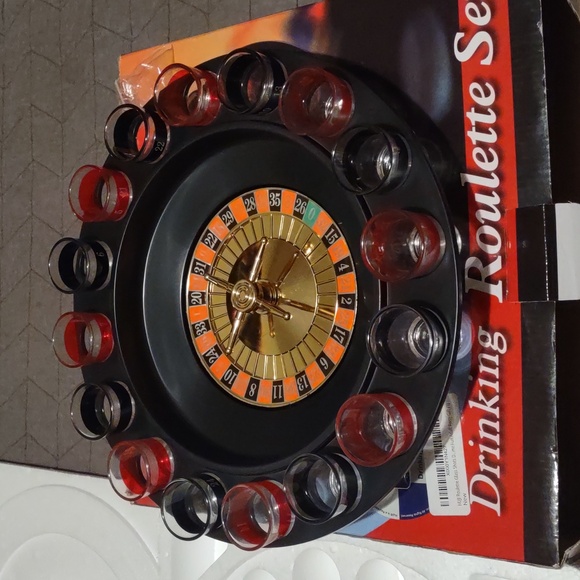 Brand new unused Drinking Roulette game. wheel spins smooth. Glasses have no chips or cracks.