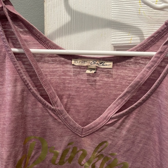 Playful "Drinking About You" Graphic T-Shirt. This fun t-shirt features a heathered mauve or dusty rose pink fabric with a unique cut-out detail at the V-neckline. The front is adorned with a metallic gold graphic that reads "Drinking About You" in a stylish script font. It has short, cuffed sleeves and a relaxed fit, perfect for a casual and cheeky statement!