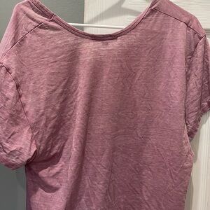 Playful "Drinking About You" Graphic T-Shirt. This fun t-shirt features a heathered mauve or dusty rose pink fabric with a unique cut-out detail at the V-neckline. The front is adorned with a metallic gold graphic that reads "Drinking About You" in a stylish script font. It has short, cuffed sleeves and a relaxed fit, perfect for a casual and cheeky statement!